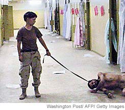 Pfc. England testified to Pentagon investigators that her participation began when she visited Tier 1A and Cpl. Graner suggested she pose holding a naked detainee on a leash. She said he led the man from his cell and put on the leash, and she stared down at him as Cpl. Graner took a picture. "I did not drag or pull on the leash," she said.